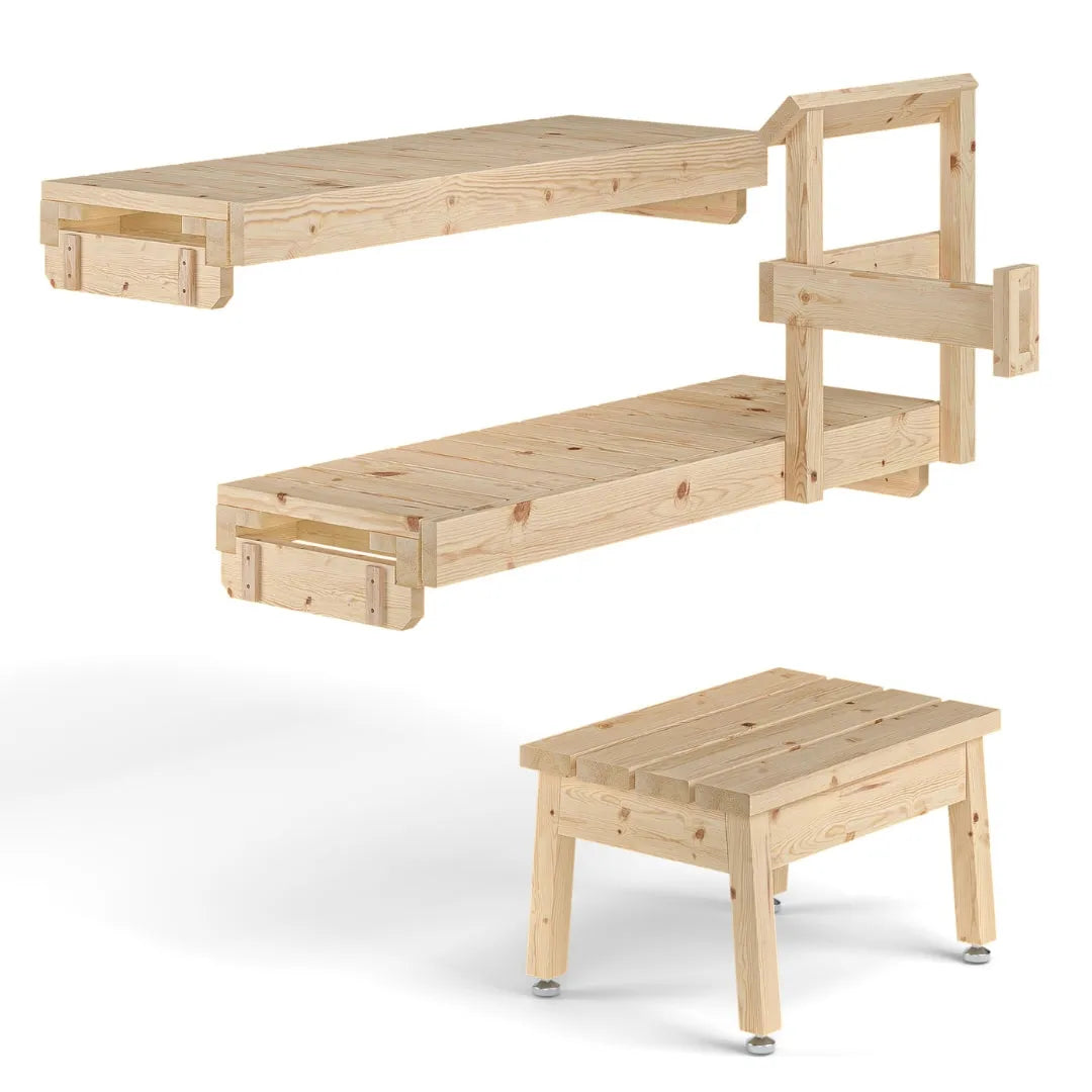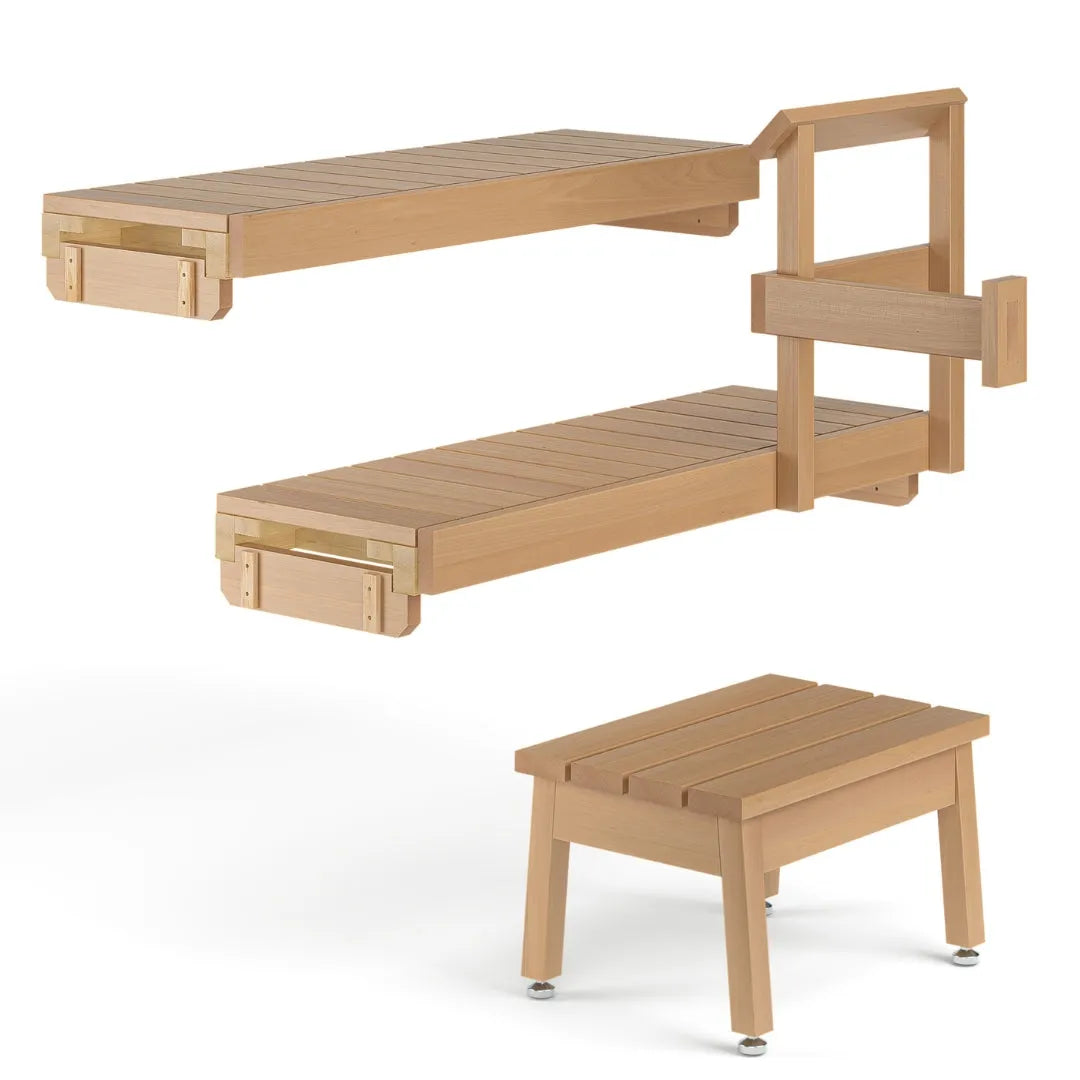 The bench package includes, in addition to the benches, a stool, sauna stove railing, and bench supports. The bench surfaces are made removable to facilitate cleaning.