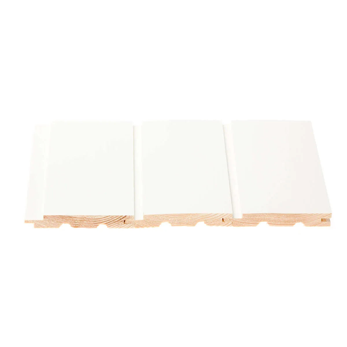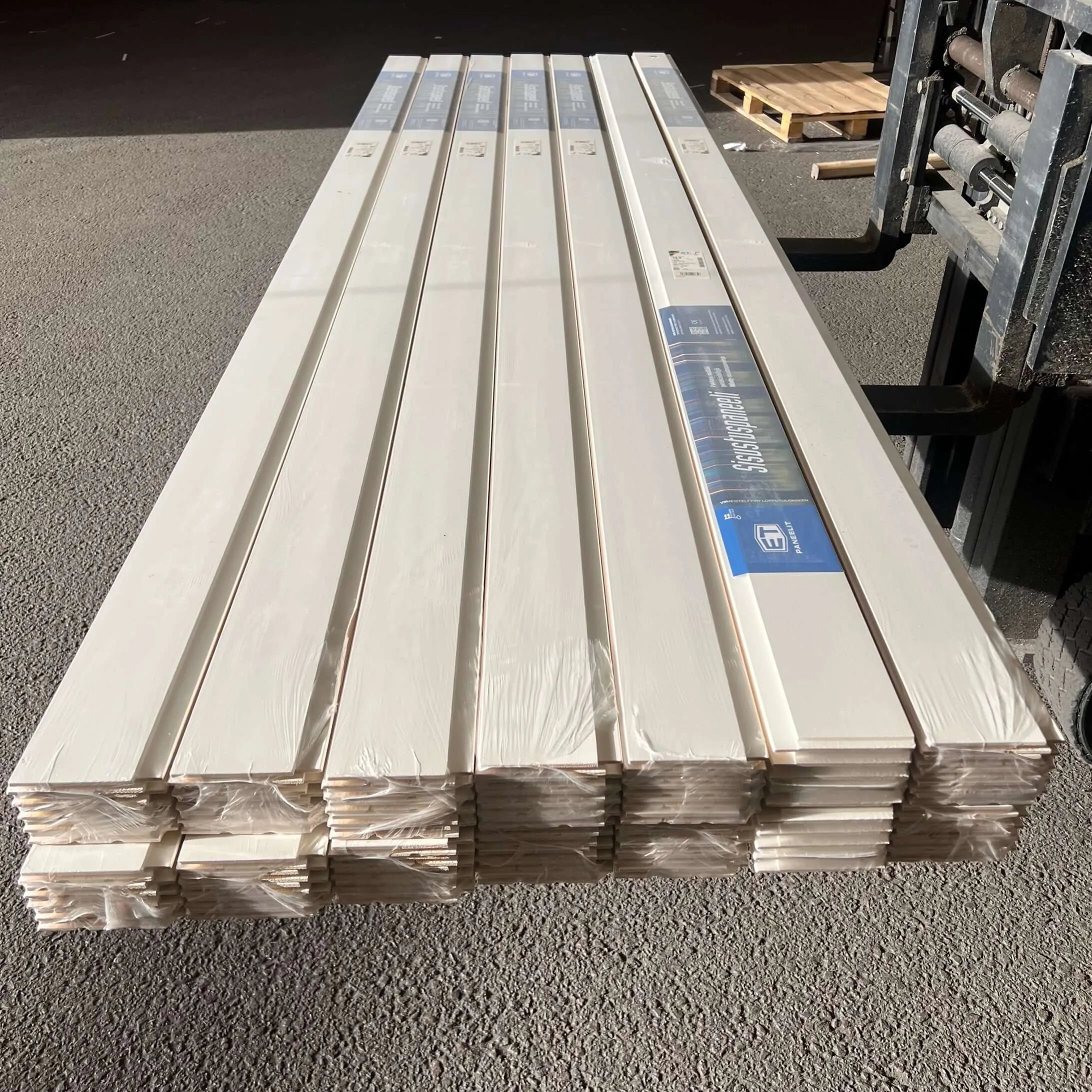 Interior panel made of domestic pine, 15x120x2980, white STS-profile. The white interior panel is suitable for both wall and ceiling panels in all dry areas of the home, as well as for the ceiling of the utility and washroom.