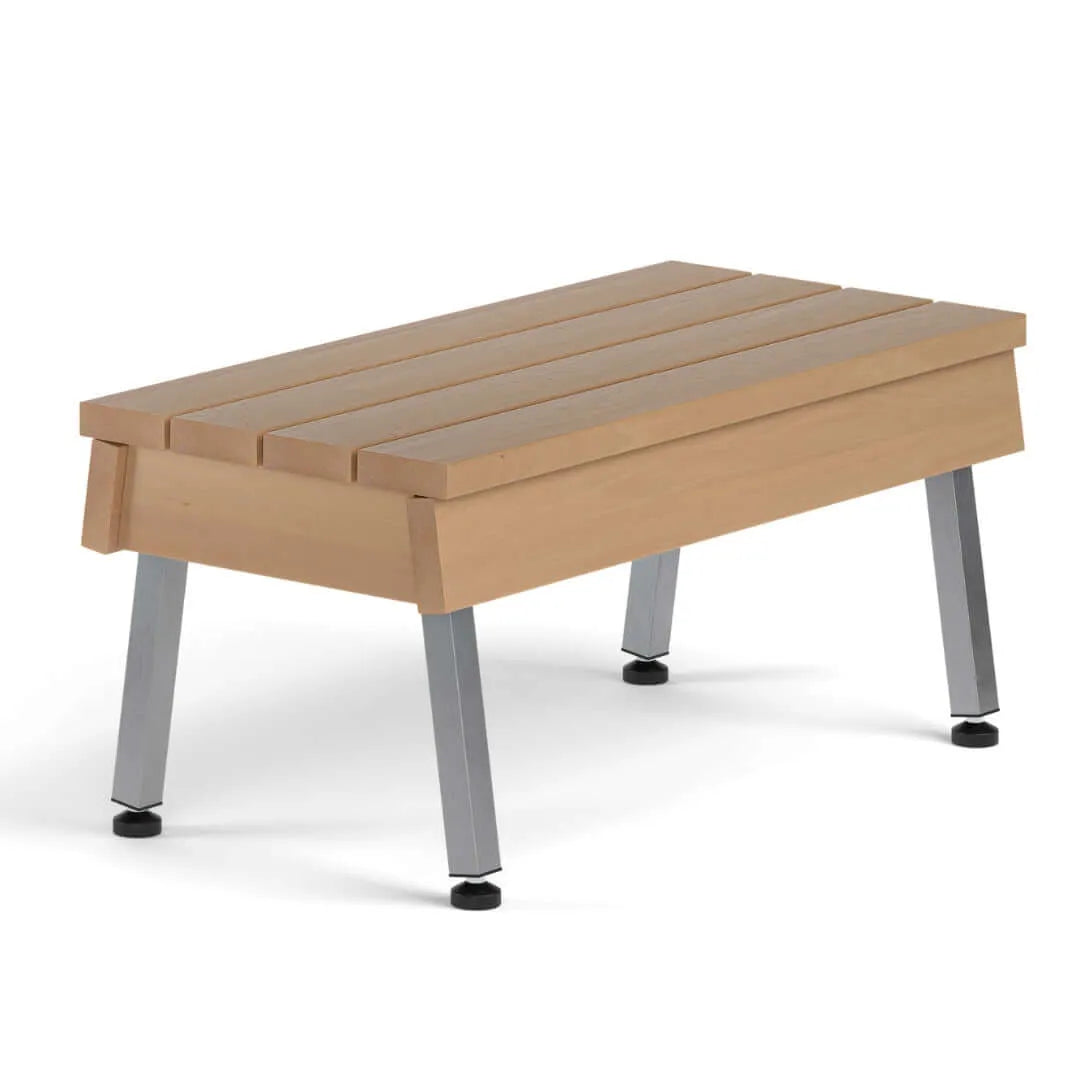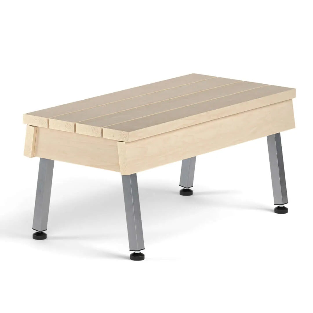The stool's width is either 600 mm or 800 mm, depth 400 mm, and height 350 mm, offering an optimal seating spot for sauna needs. You can choose from several surface materials such as aspen, spruce, alder, and thermo aspen, and the frame is made from the same material as the surface, ensuring a uniform and refined appearance.