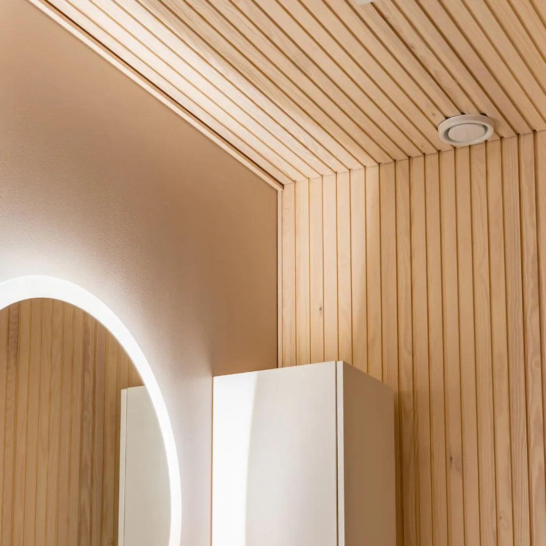 A white lacquered shadow moulding made from knot-free pine. This interior moulding is suitable for dry spaces and bathroom ceilings.