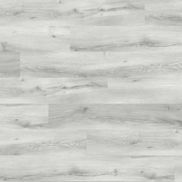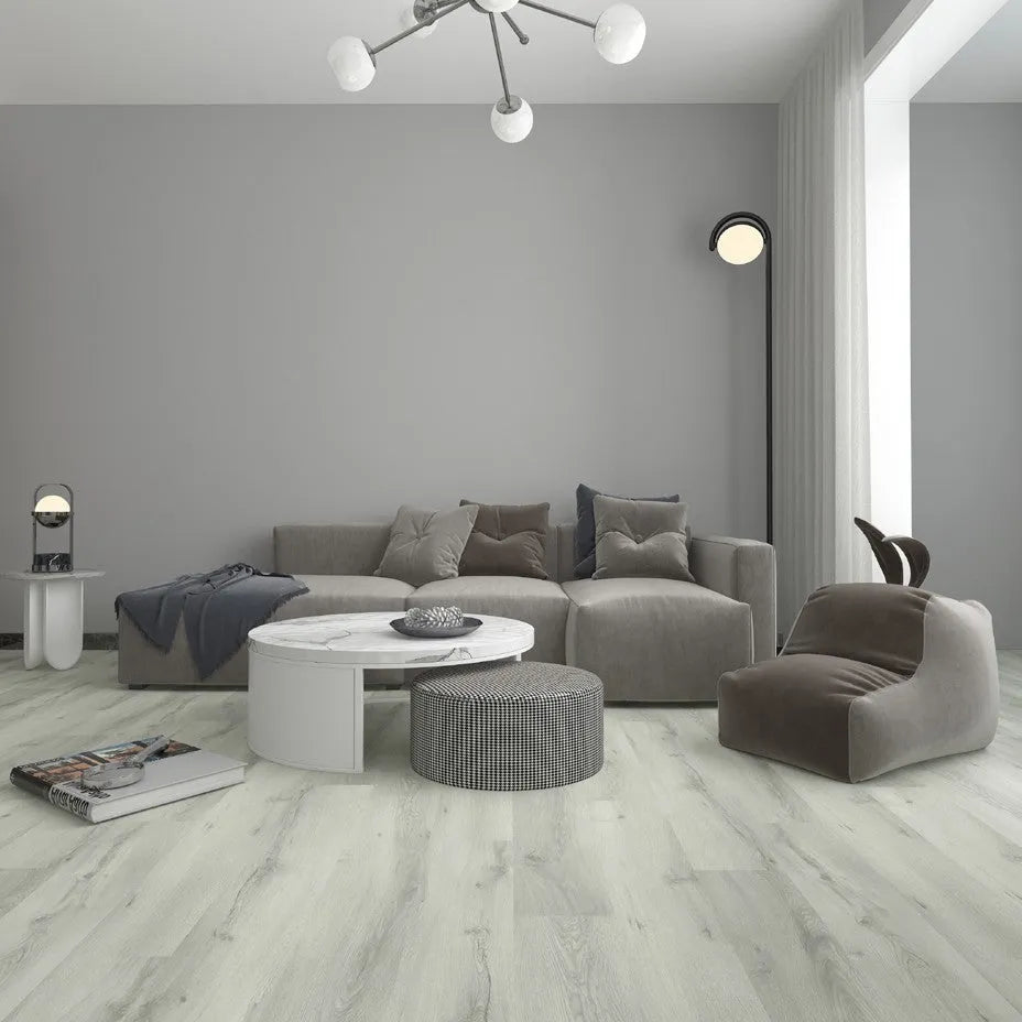 A rigid vinyl floor installed as a floating floor with a click-lock i4F system that enhances and simplifies the installation process. This plank is 5.0 mm thick, with a 0.55 mm wear layer on top. Light gray wood grain pattern.