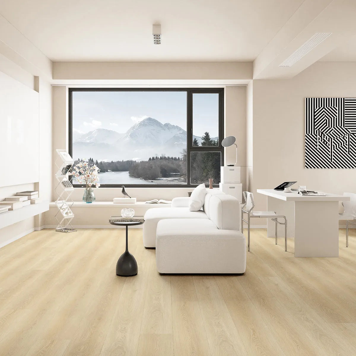 3874EIR Ljus Alholma SPC vinyl flooring offers a high-quality floor covering that elegantly complements home or office interiors. The specially thick 0.7mm wear layer and usage class 34 make it especially durable against dents and wear. The light oak pattern reflects the natural beauty of wood, bringing a sense of nature and light indoors. The floor surface features EIR embossing, where the embossing is aligned with the surface pattern, making the planks feel even more authentic than a normal light surface pattern. Additionally, the floor feels pleasant underfoot and is silent in use. SPC vinyl flooring is designed with durability and longevity in mind; its minimal expansion and good UV resistance make it an excellent choice for flooring material. Besides being moisture resistant, it is also warm, soft, and easy to maintain. The floor is designed for user comfort, including integrated impact sound insulation that reduces noise.