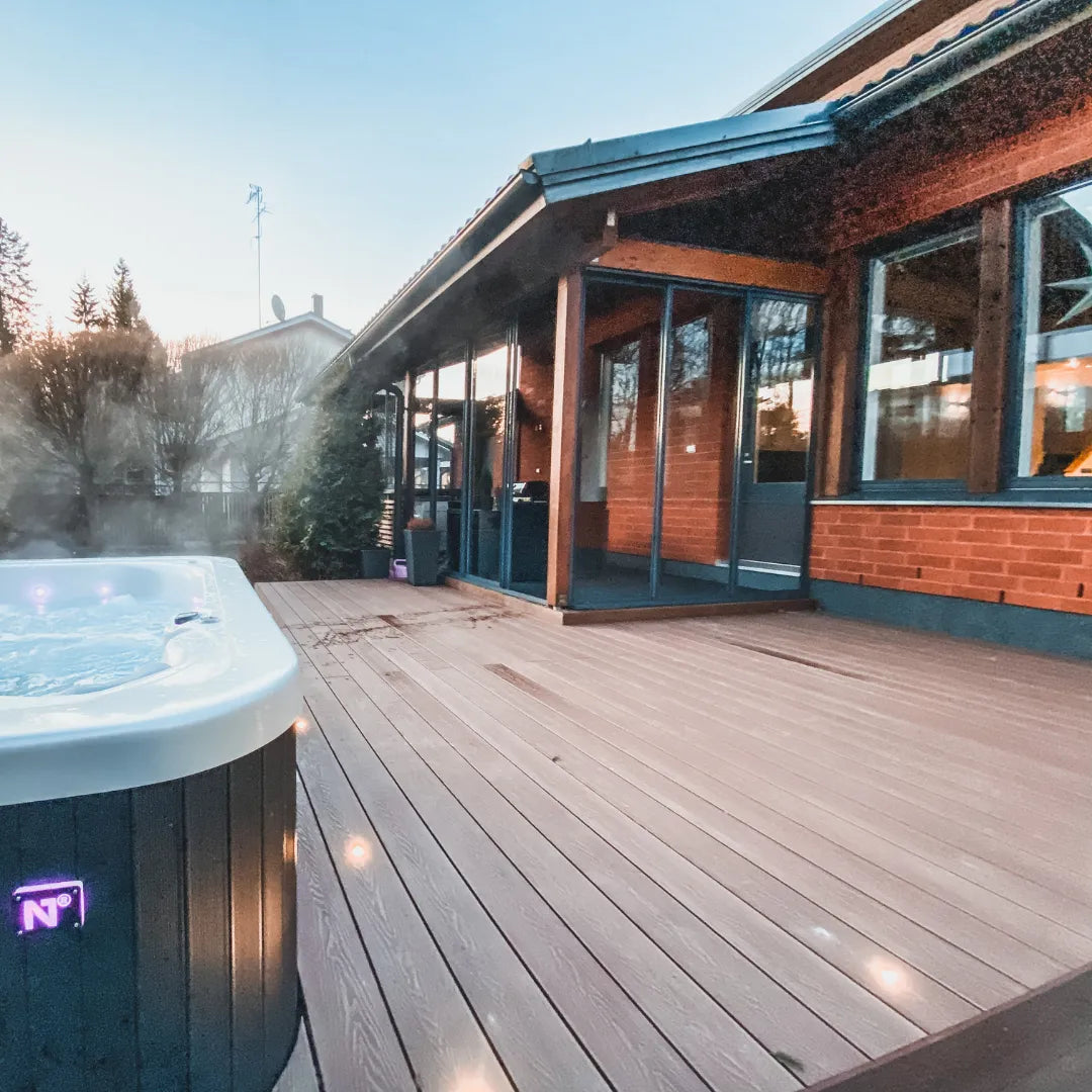 Materiaali on PVC-vapaa, kierrätyspuukuidun ja kierrätysmuovin seos, joka kestää pohjoisen olosuhteita loistavasti, eikä vaadi pintakäsittelyä.