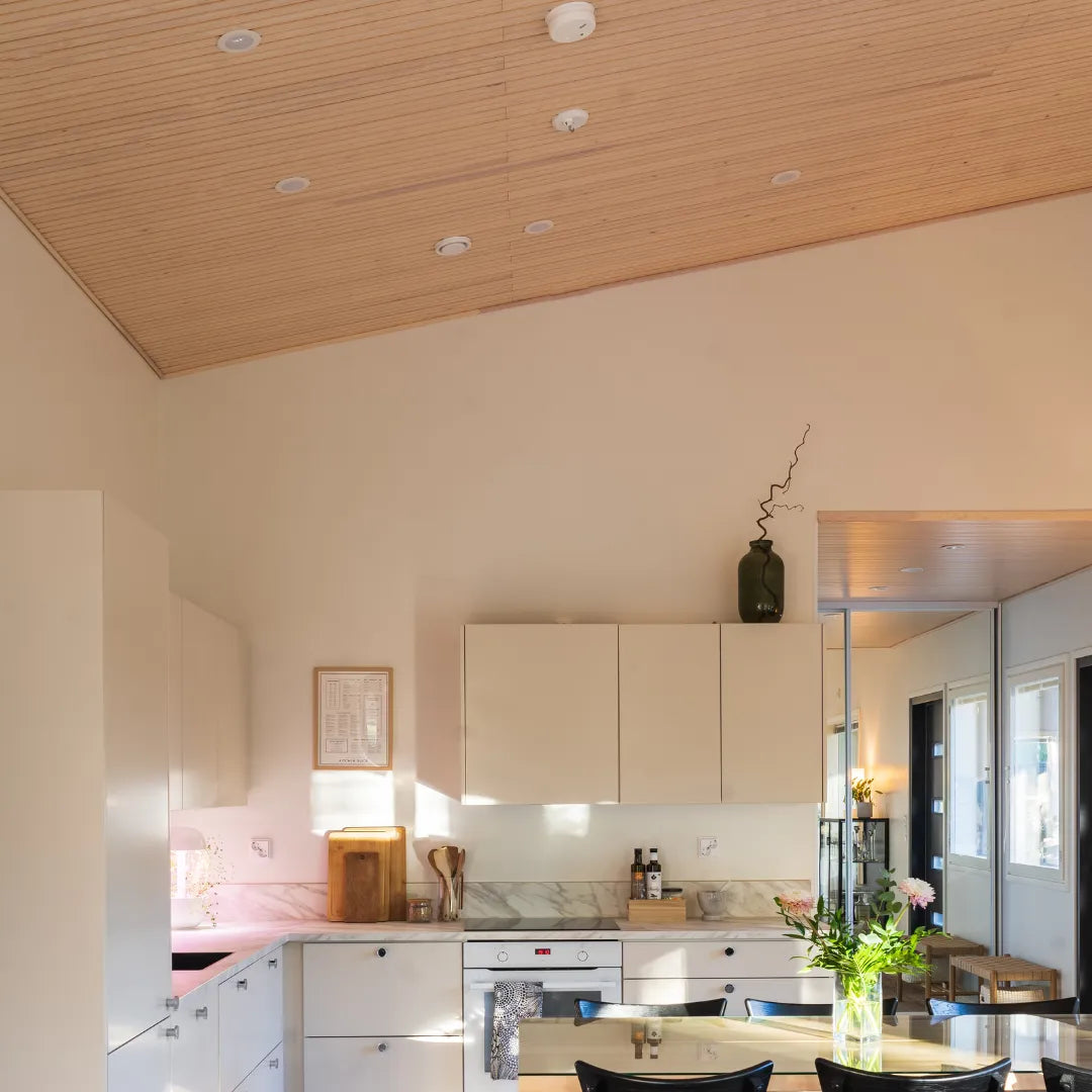 Rimapaneeli soveltuu kaikkiin kodin kuiviin tiloihin sekä pesuhuoneen kattoon. Pofiililtaan rimamainen sisustuspaneeli muodostaa eläväisen lopputuloksen, joka elää valon, varjon ja katsekulman mukaan.