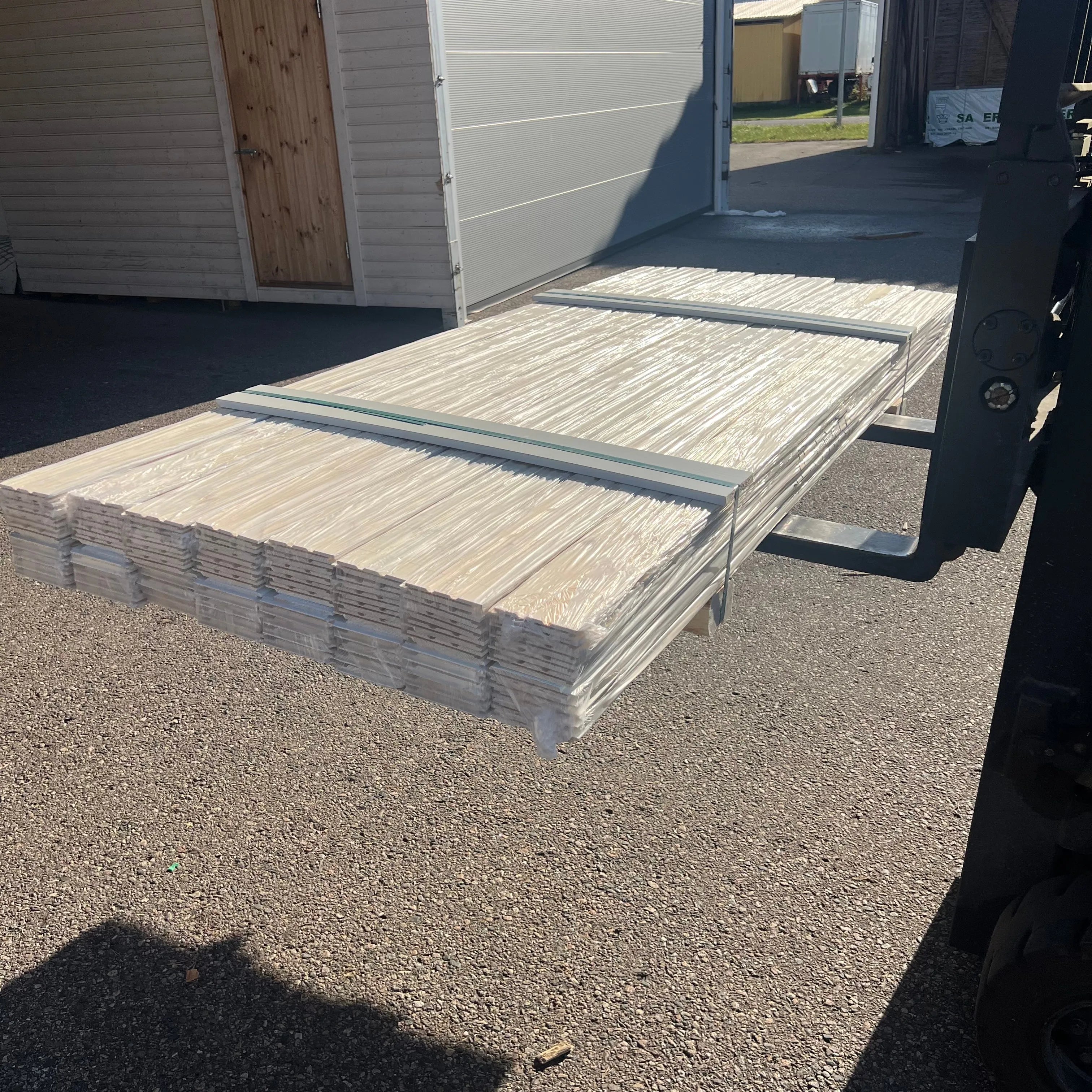 Kotimaisesta männystä valmistettu 15x120 STP-profiilinen harjattu, valkoiseksi maalattu sisustuspaneeli.