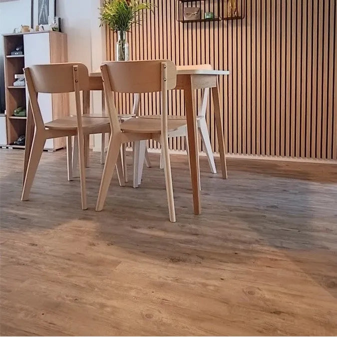Natur Sviby SPC-vinyylilattia tarjoaa korkealuokkaisen ja M1-luokitellun lattiapäällysteen, joka täydentää kodin sisustusta elegantilla tavalla. Sen syvä ruskea sävy heijastaa puun luonnollista kauneutta, tuoden luonnon tuntua sisätiloihin. Lattian pinta on varustettu kohokuviolla, mikä lisää aitouden tuntua, ja se on miellyttävän tuntuinen jalkojen alla sekä äänetön käytössä. SPC-vinyylilattia on suunniteltu kestävyyttä ja pitkäikäisyyttä silmällä pitäen; sen vähäinen eläminen ja hyvä UV-säteilyn kesto tekevät siitä erinomaisen valinnan lattiamateriaaliksi. Sen lisäksi, että se pitää hyvin kosteutta, se on myös lämmin, pehmeä ja helppohoitoinen. Lattia on suunniteltu käyttömukavuutta ajatellen, mukaan lukien integroitu askeläänieriste, joka vähentää melua.